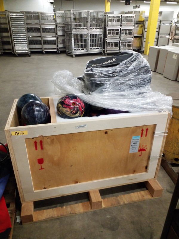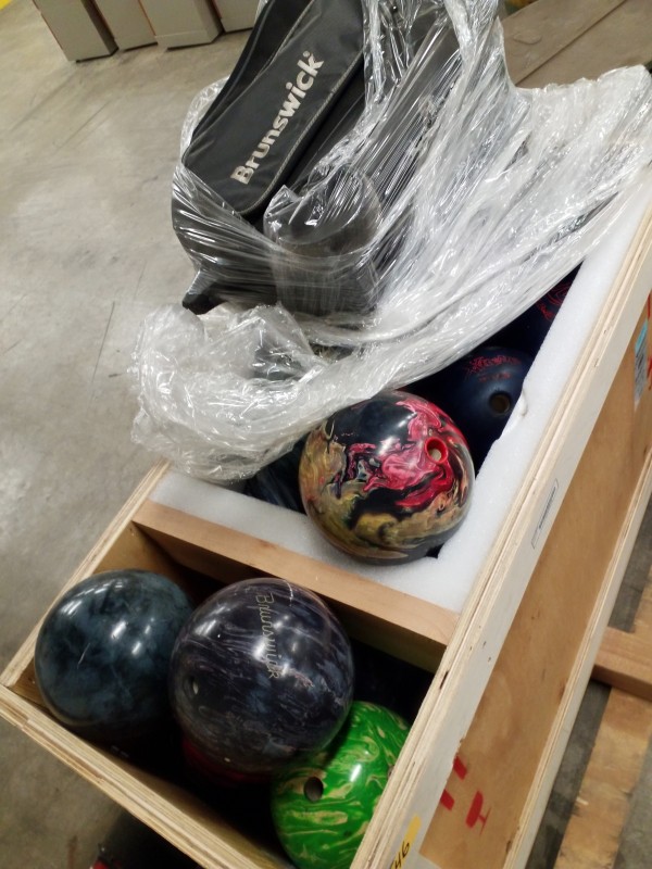 Description: 1 each crate full of bowling balls and 1 each Brunswick bag.