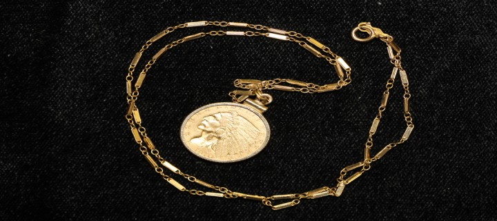 1-14KT GOLD NECKLACE WITH 1910 INDIAN HEAD 2 1/2 DOLLAR GOLD PIECE PENDANT. NECKLACE AND BEZEL ARE APPROX 2.7 GRAMS.