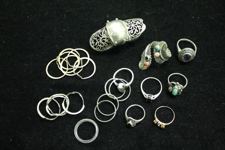 14-MISC RINGS CONSISTING OF 4.6 GRAMS OF 14KT GOLD AND 29.1 GRAMS OF STERLING INCLUDING STONES, 1-PAIR 14KT GOLD EARRINGS WITH CZ STONES, 2-STERLING SILVER NECKLACES, 1-STERLING BRACELET WITH CZ STONES AND 4-MISC COSTUME NECKLACES.
