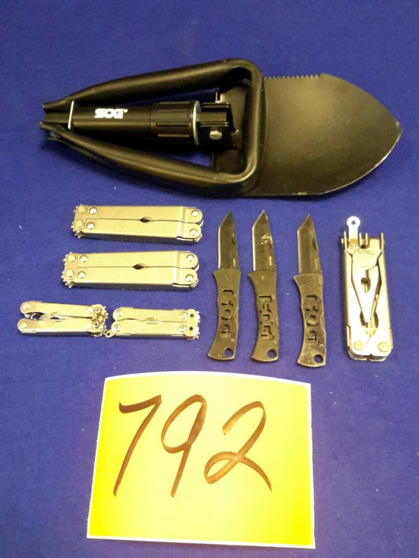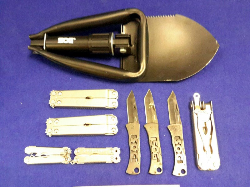 Description: Lot consisting of Sog multi-tools, pocket knives and 1 each folding shovel.