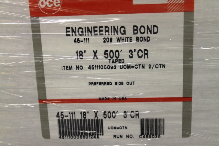 Pallet of 108 Rolls of OCE' Engineering Bond-20# White Bond - #45-111 - 18" X 500'- 3"CR Paper,.