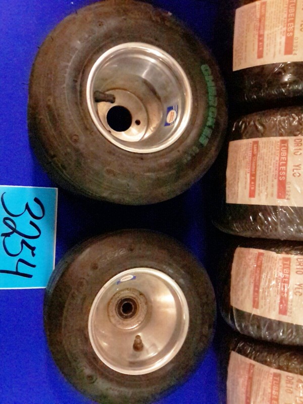 Description: Lot consisting of 4 each new Bridgestone racing kart tires and 2 each used rims and tires. See picture gallery.