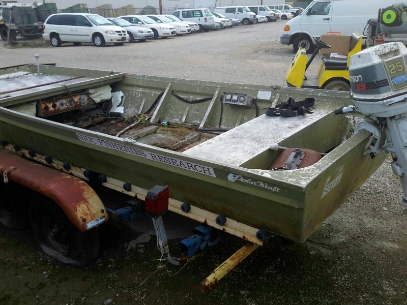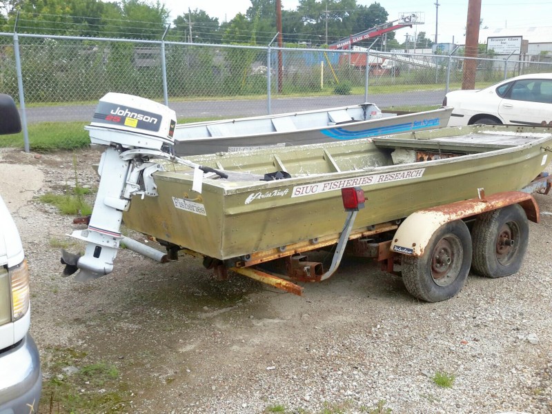 Description: 1 each Polar Kraft Jon boat with Holsclaw trailer and 25hp Johnson outboard motor. Trailer has a title only, NO TITLE for the boat. Unit has one low and two flat tires. No known history and/or condition of the units in this lot. See picture gallery.