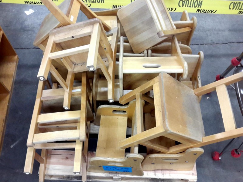 Description: Pallet consisting of miscellaneous wooden childrens chairs. See picture gallery.