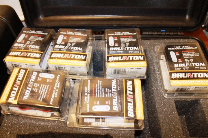 Brunton Portable Power Station, solo power pack, model# 12-solo, Solar Panel Charger and 6 Brunton 7amp-12v-Solar Charge Controllers, in 2 separate hard plastic carry case, battery pack is dead,