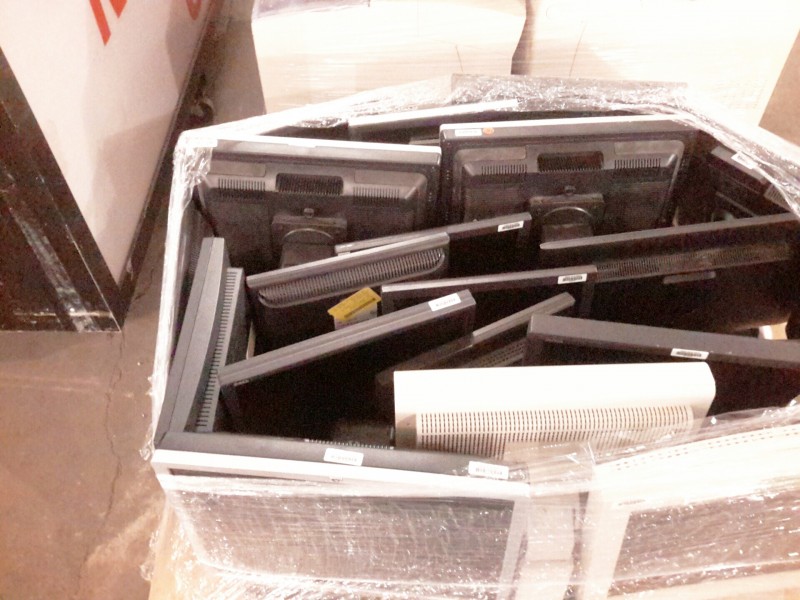 Description: This pallets contains misc. brands of flat monitors. Multiple sizes of monitors on pallet. No power cords. No garantee of working condition.