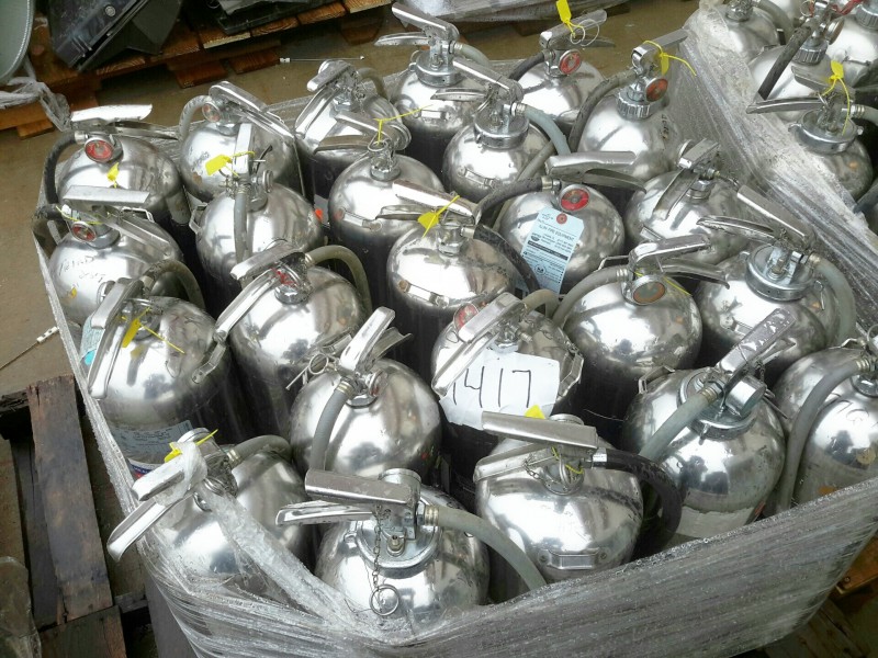 Description: Pallet of water fire extinguishers. Each extinguisher stands 24" tall and are Stainless Steel.