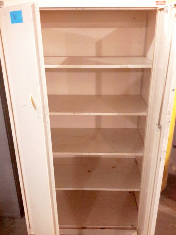 Description: 2 door white metal cabinet - 1 each. Has 4 shelves and has no key to it.