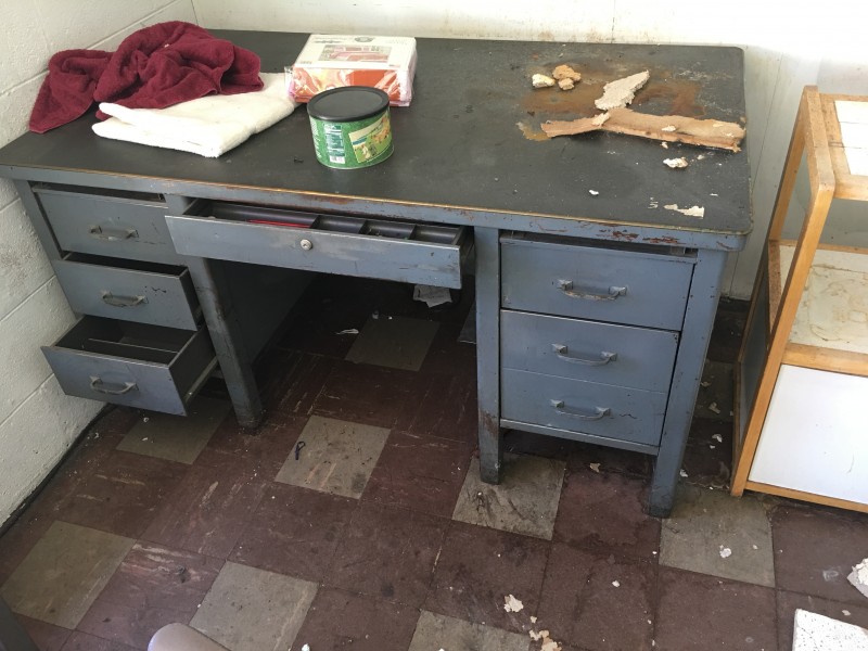 Gery Desk. Working condition unknown. Any questions please contact Karin Johns at kjohns@riverside.il.us