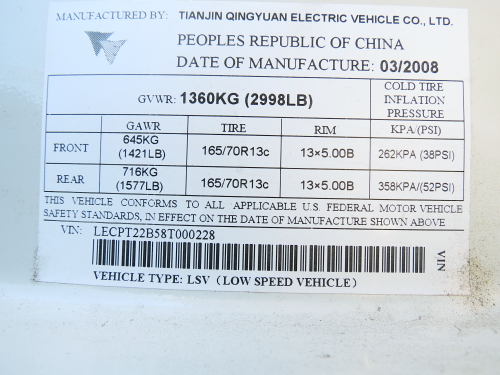 MILES ELECTRIC VEHICLE, BODY STYLE: PICKUP, YEAR: 2008, MILES MODEL #ZX40ST. MILEAGE IS UNKNOWN, VEHICLE IS IN POOR CONDITION. VEHICLE CONTAINS NO BATTERY AND DOES NOT RUN. VEHICLE CONTAINS DENTS, SCRATCHES AND, RUST. MANUFACTURED IN CHINA. VIN #LECPT22B58T000228