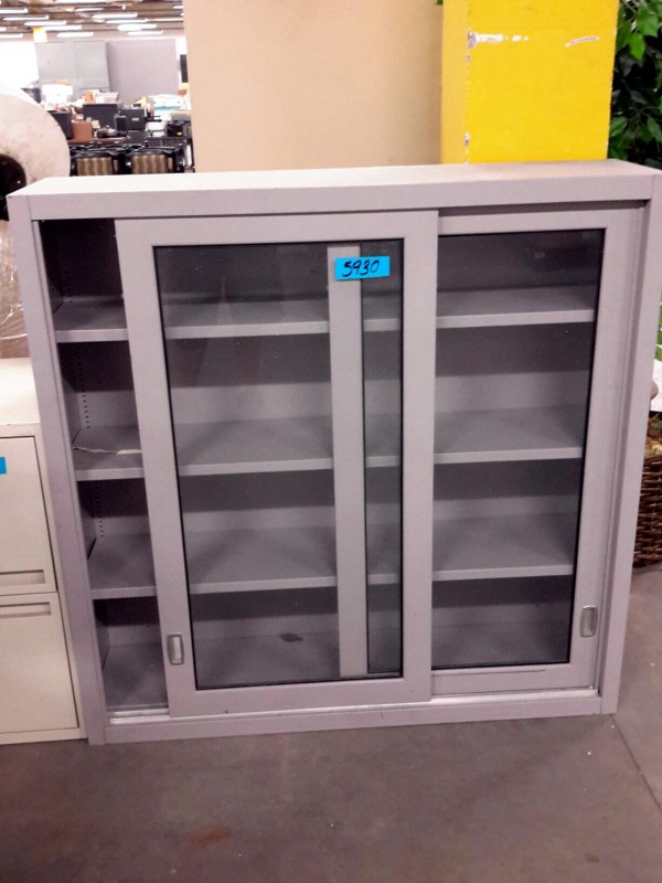 Description: 1 each metal bookcase with glass doors.