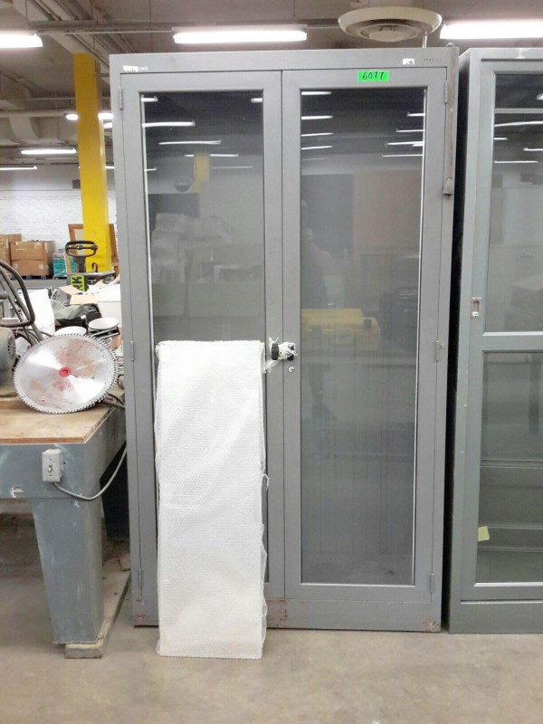 Description: 1 each metal cabinet with interior lighting, glass doors and 2 each plexi glass shelves. The unit is unlocked, no key available.