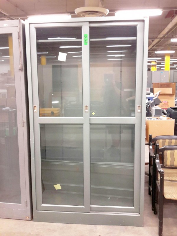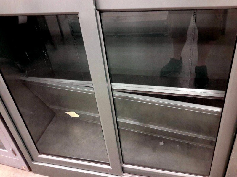 Description: 1 each metal cabinet with glass sliding doors and metal shelves inside.