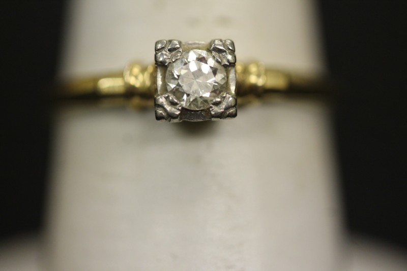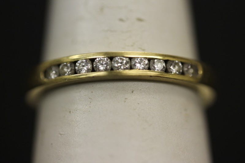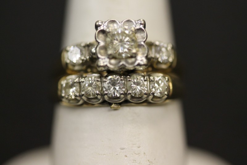 LOT 53 - 14K YELLOW GOLD WEDDING SET & OTHERS; 1-14K RING WITH CENTER DIAMOND & ACCENT STONES ON EACH SIDE & MATCHING BAND WITH 5 STONES 5.4g TL WT INCLUDING STONES, 1-14K RING WITH SINGLE DIAMOND 1.6g TL WT, 1-14K RING WITH SINGLE DIAMOND OFFSET BAND 3.3g TL WT, 1-14K BAND WITH 9 SMALL DIAMOND STONES 2.2g TL WT.