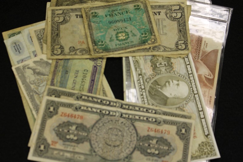 LOT 56 - 39 FOREIGN NOTES INCLUDING; CANADIAN: 4-1979 TWENTY DOLLAR BILLS, 3-1971 TEN DOLLAR BILLS, 4-1972 FIVE DOLLAR BILLS, 1-1954 TWO DOLLAR BILL, 9-1973 ONE DOLLAR BILLS & 18 MISCELLANEOUS FOREIGN BILLS.