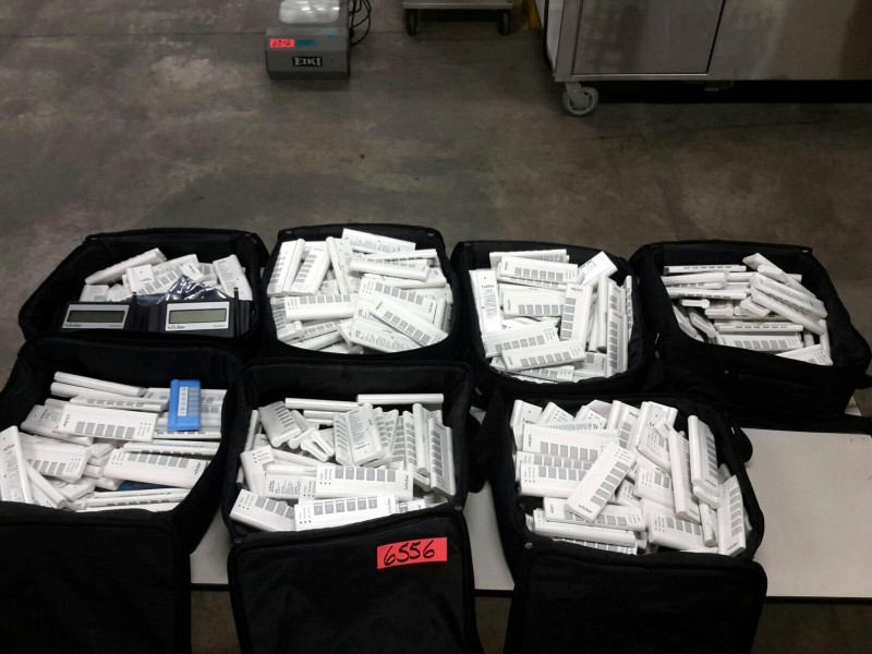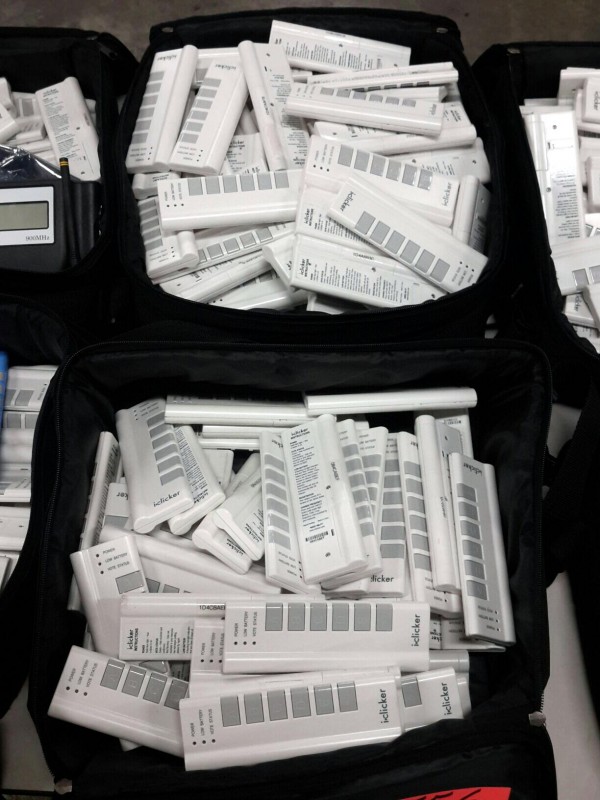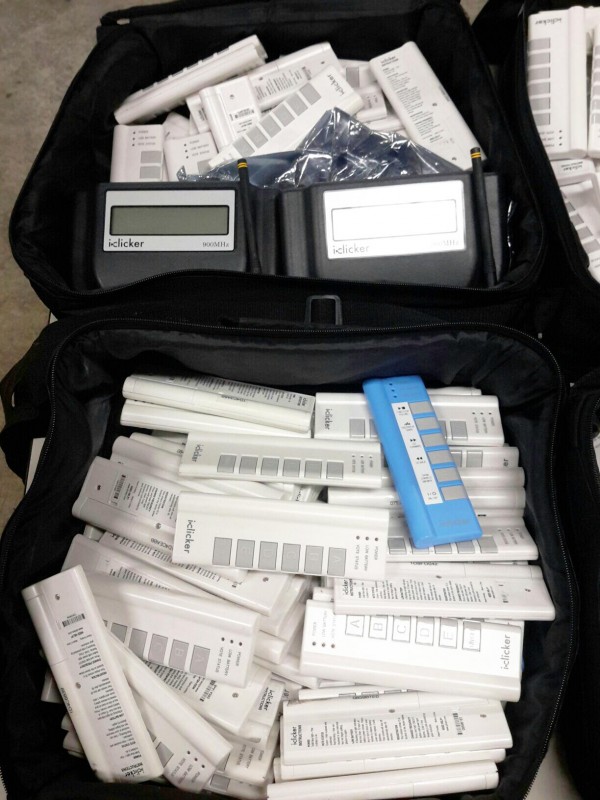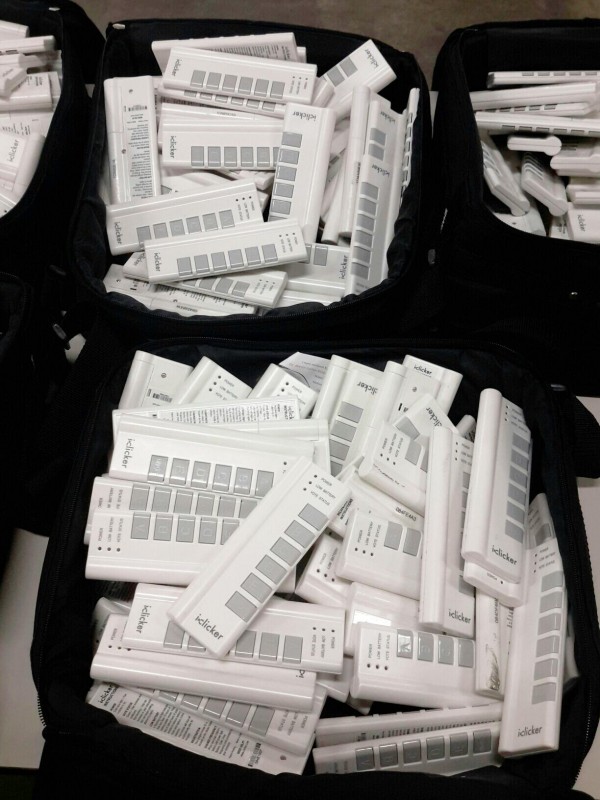 Description: Table lot consisting of 7 each bags full of iClicker remotes and 2 each base units. This setup is used to engage students in the classroom to respond to questions through remote access.