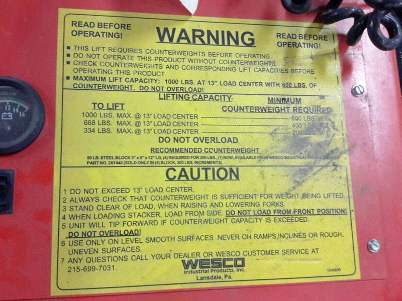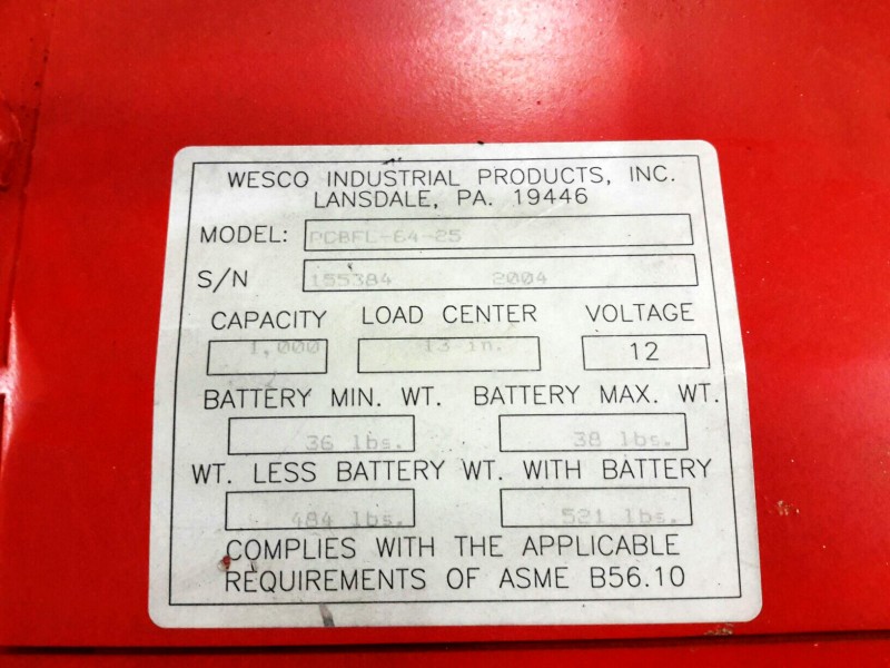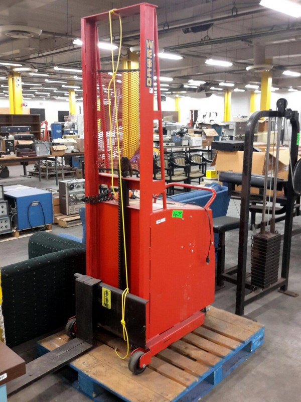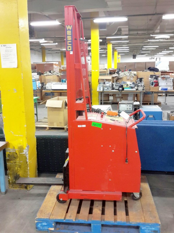 Description: 1 each Wesco model PCBFL-64-25 counter balanced power stacker. This unit is missing the key.