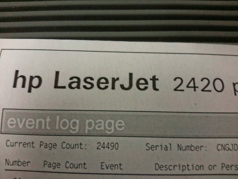 Description: HP laserjet 2420 printer - 1 each. The test page on this printer states the page count is at 24490. This printer comes with a toner cartridge. Printer comes with power cord.