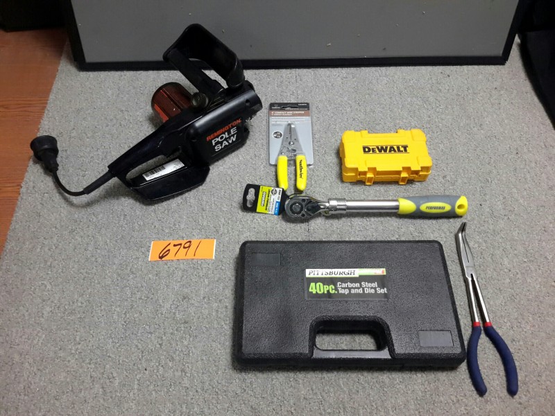 Description: Lot consisting of miscellaneous hand tools incuding - 1 each Remington electric pole saw, 1 each DeWalt drill bit set, 1 each Southwire wire strippers, 1 each Performax extendable ratchet, 1 each Pittsburgh tap and die set, and 1 each Pittsburgh needle nose angled pliers.