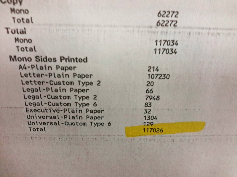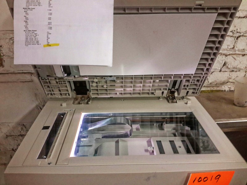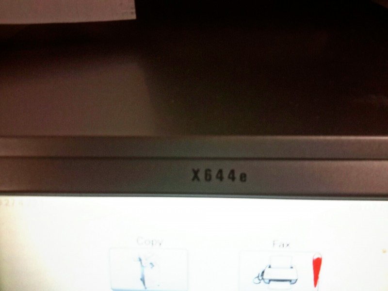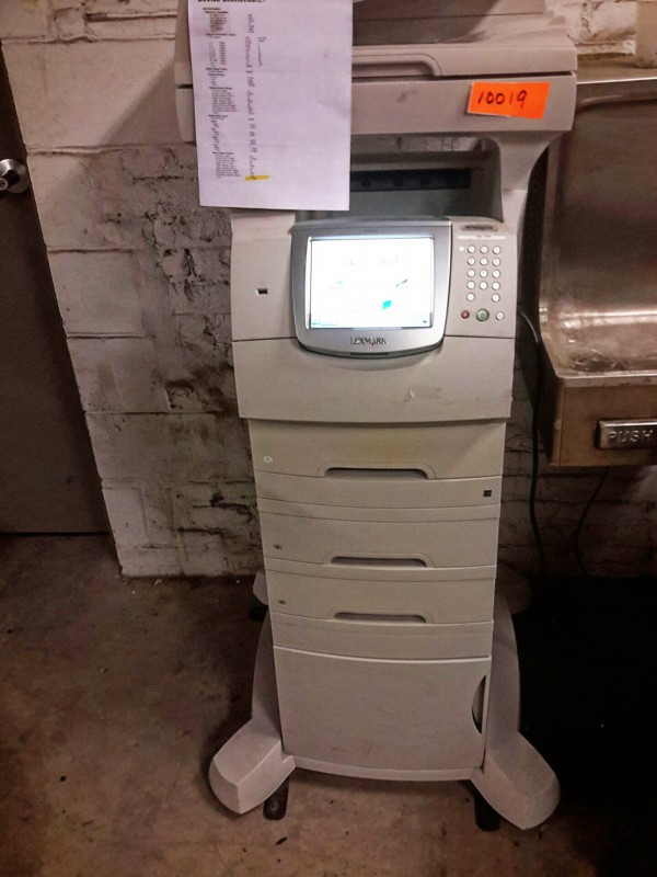 Description: Lexmark X644e All-in-One - 1 each. Machine has printed 117026 copies according to the statics page. Has a toner cartridge in it. Machine has extra trays and comes on a wheeled stand. Printer stands 58" tall when pieces are stacked.
