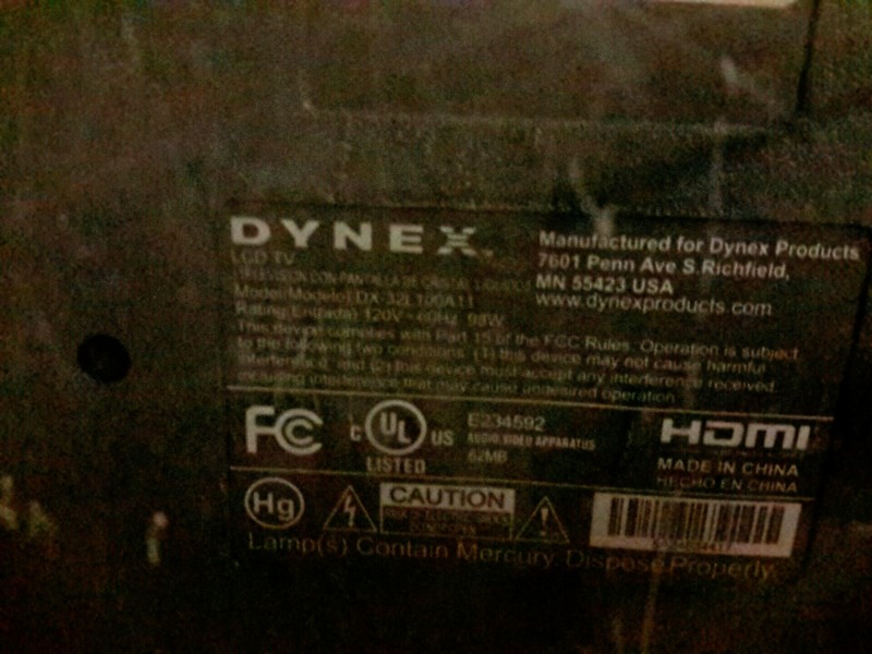 Description: Dynex 32" LCD flat screen TV - 1 each. Model # DX32L-100A11. Comes with power cord.