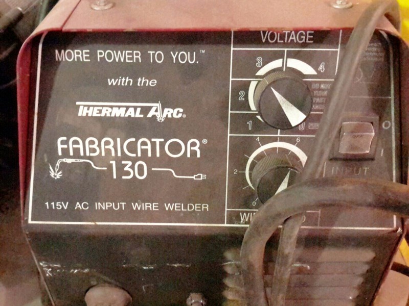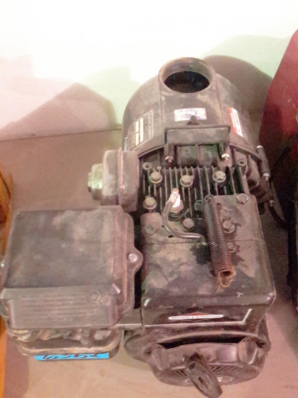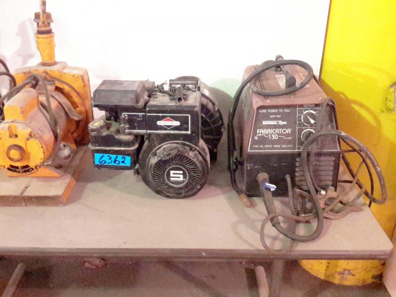 Description: Table lot consisting of 1 each Chicago Pneumatic drill press, 1 each Barnes pump, 1 each Briggs & Stratton motor 5hp not locked up with a Pacer pump, and 1 each Thermal Arc Fabricator 130 wire welder.