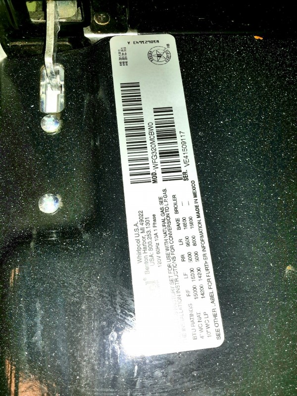 Description: 1 each Whirlpool gas range. All hardware is in the bottom warming drawer for this unit. Range was replaced due to an upgrade. To see the model number look in the picture gallery.