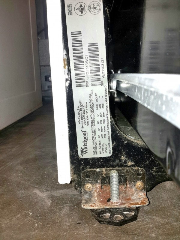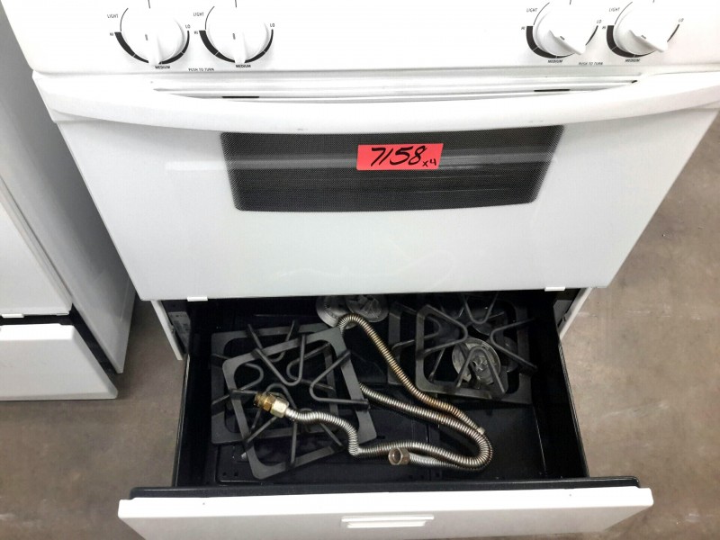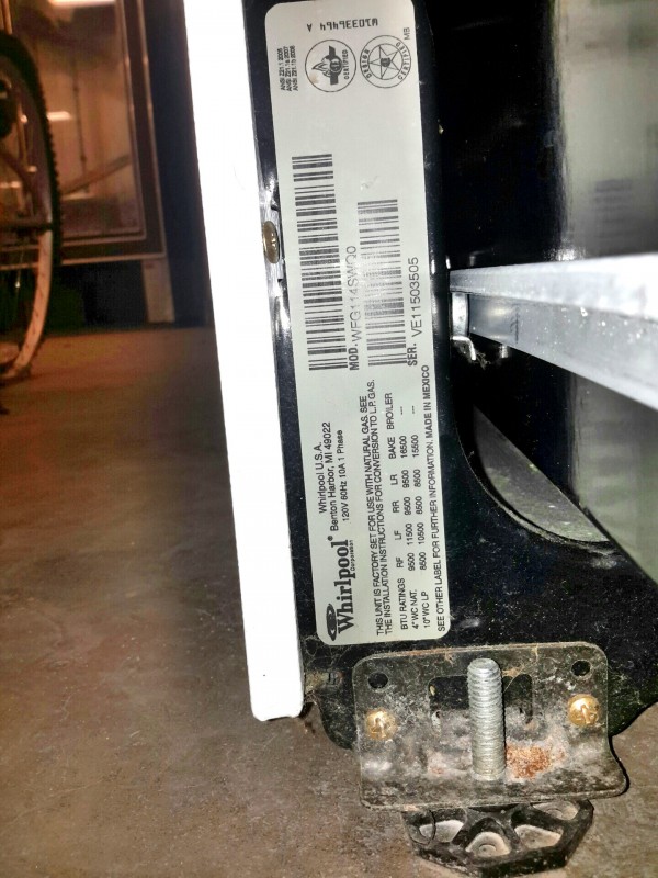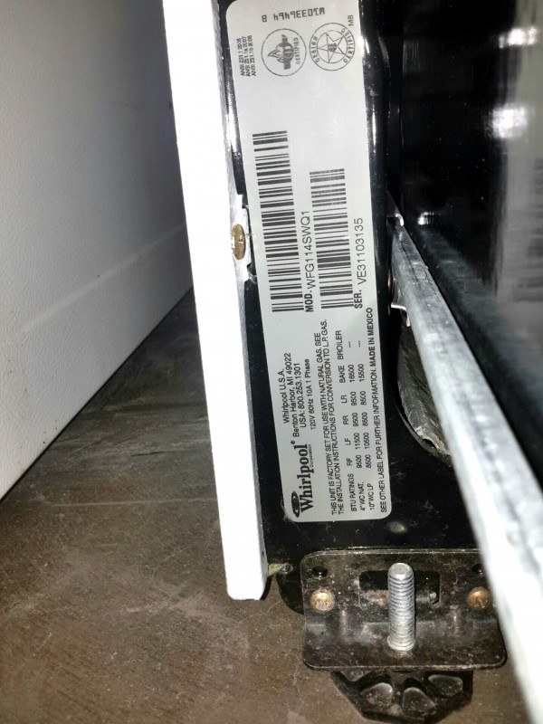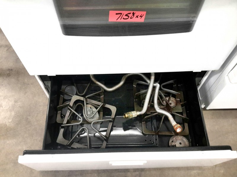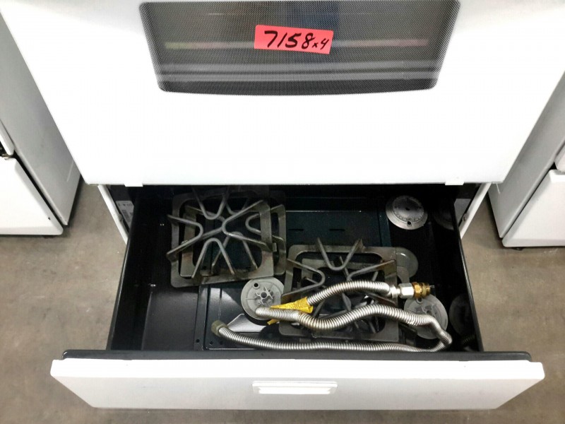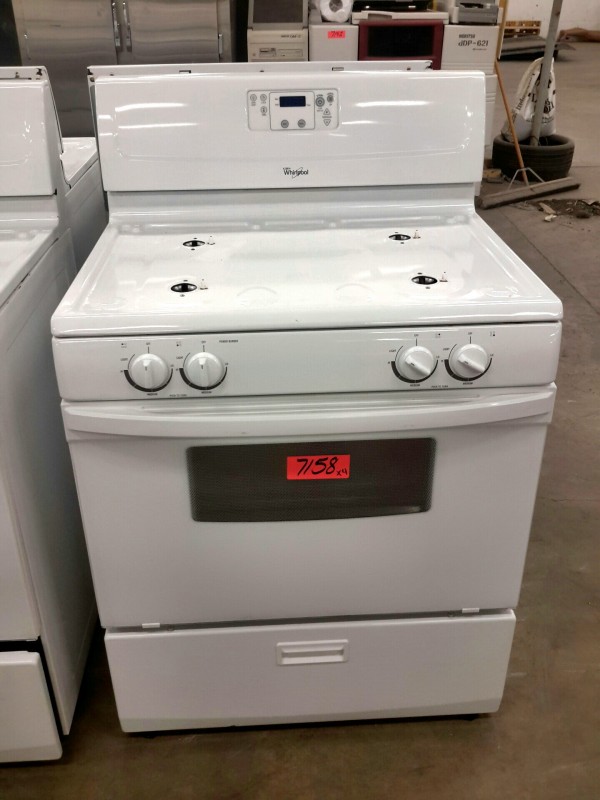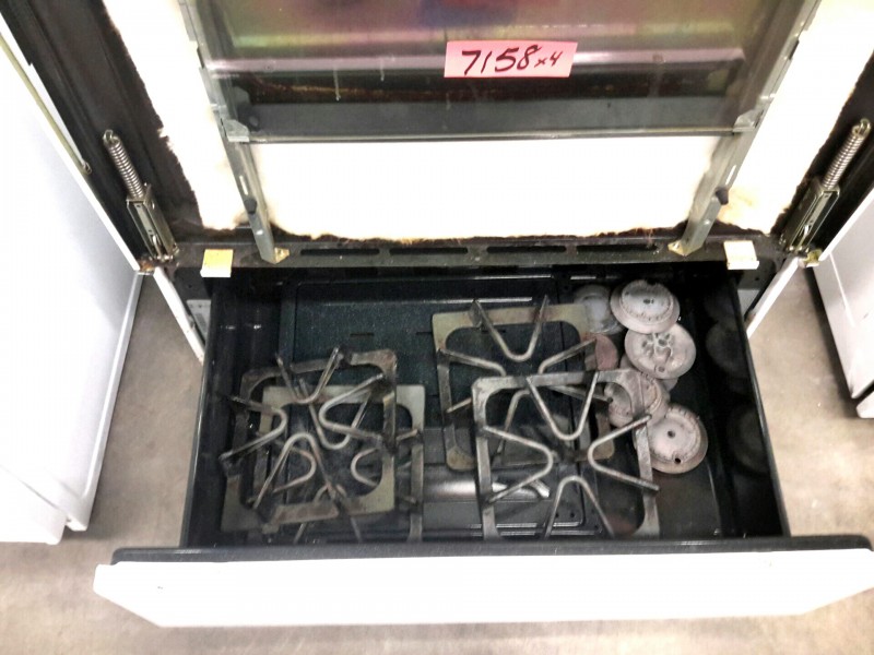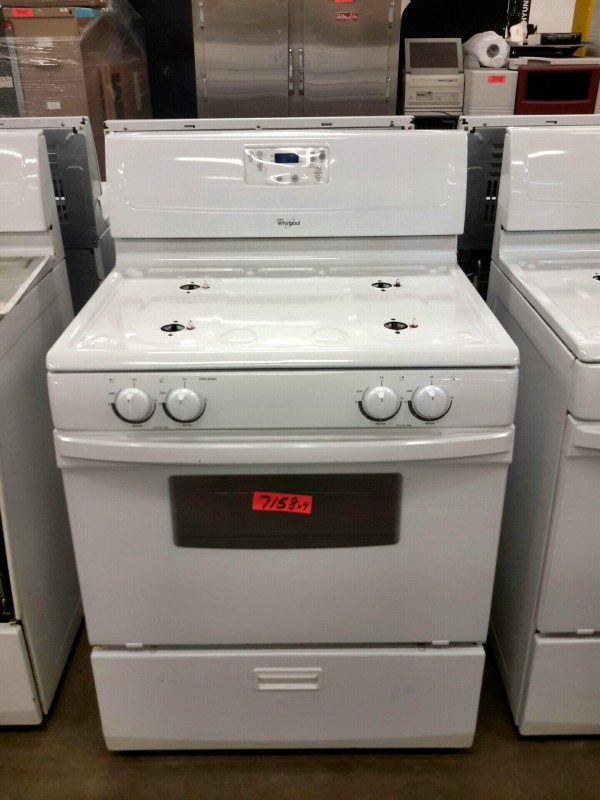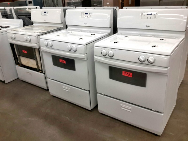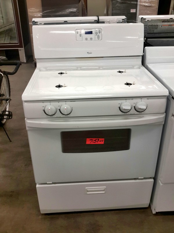 Description: 4 each Whirlpool gas ranges. All hardware is in the bottom warming drawer for these units. Ranges were replaced due to an upgrade. To see the model number look in the picture gallery. One each unit will need the door repaired.