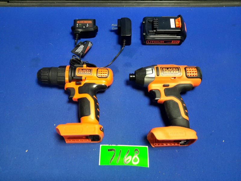 Description: Lot consisting of 1 each 20 volt Black & Decker drill, impact drill, battery, and battery charger.