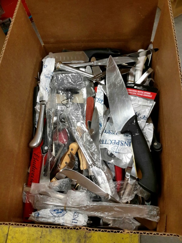 Description: 1 each box consisting of miscellaneous kitchen utensils. Box dimensions = 17 1/4"x11 1/4' x 9 1/2'