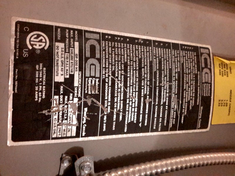 Description: 1 each Frost Fighter Indirect Fired 500,000btu heater model IDF-500 HS.