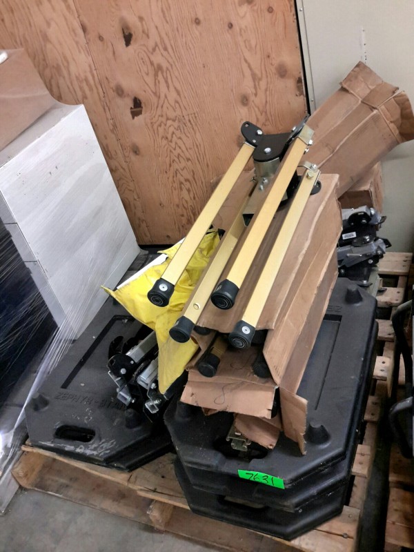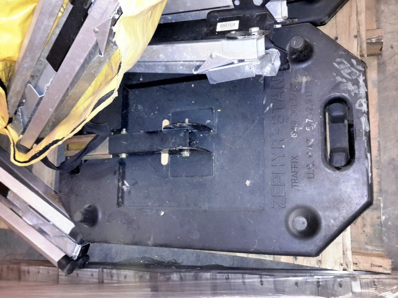 Description: 1 each pallet consisting of miscellaneous traffic sign stands. Pallet has Zephyr Traffix sign bases and other four legged base stands.