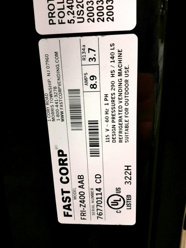 Description: 1 each Fast Corp model FRI-Z400 AAB ice cream vending machine.