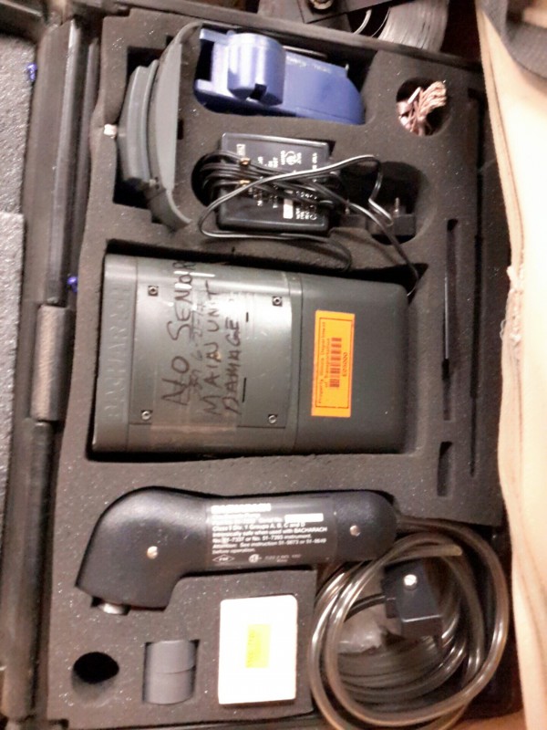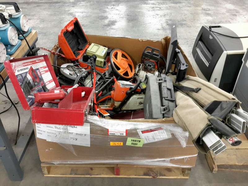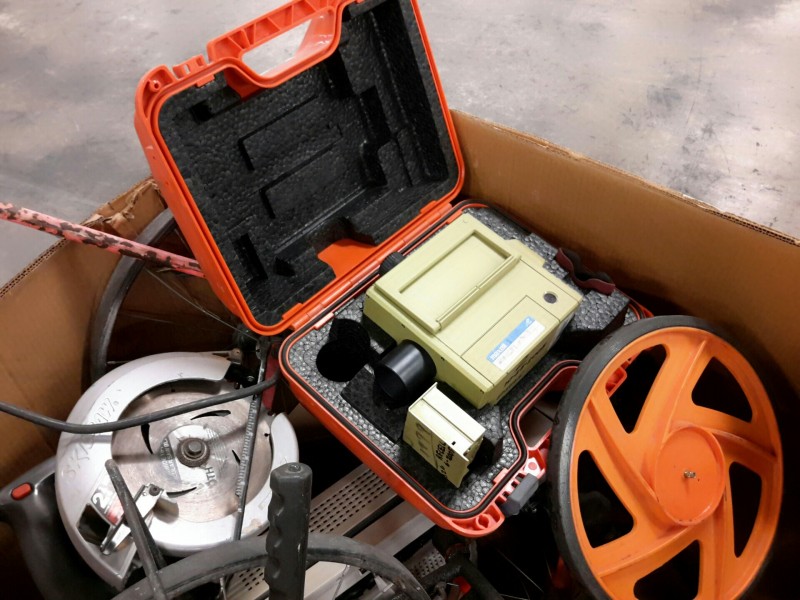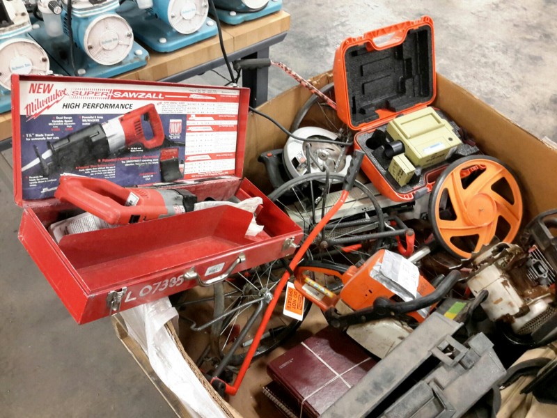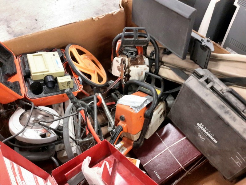 Description: 1 each box consisting of miscellaneous tools and other - 1 each Milwaukee Sawzall in case, 2 each Stihl chainsaws without blades, 1 each Skil circular saw, some measuring wheels, Transit measuring stick, a key board tray, and othe miscellaneous equipment.