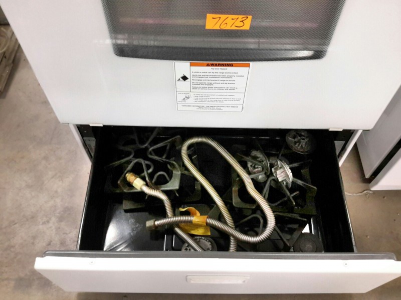 Description: Lot consisting of 1 each Whirlpool gas range. Hardware for the range are located in the bottom drawer. The model number for the unit can be seen in the picture gallery.