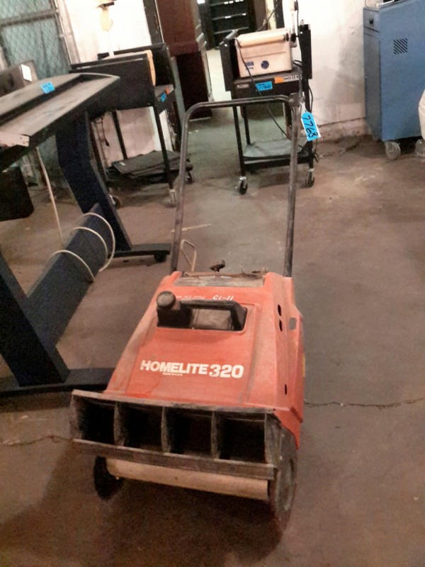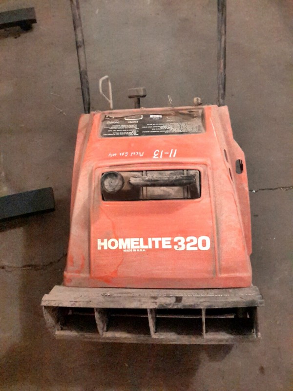 Description: 1 each Homelite 320 snowblower. Motor spins free, not locked up.