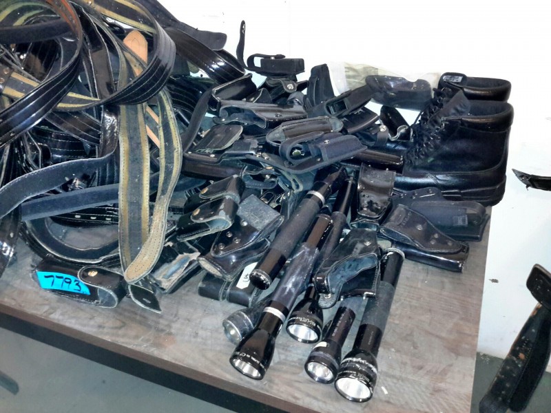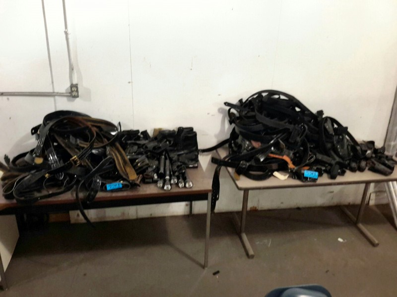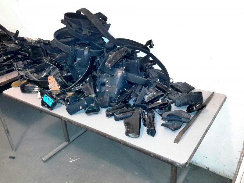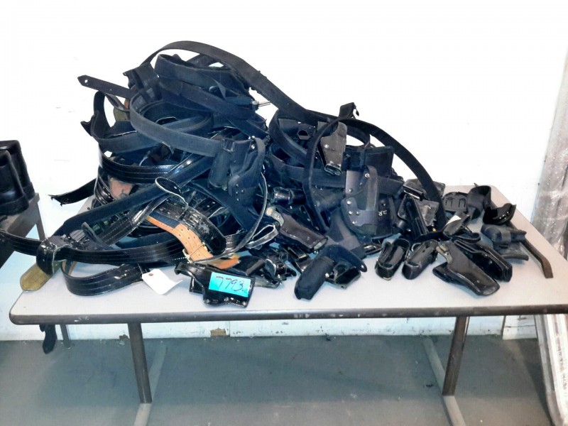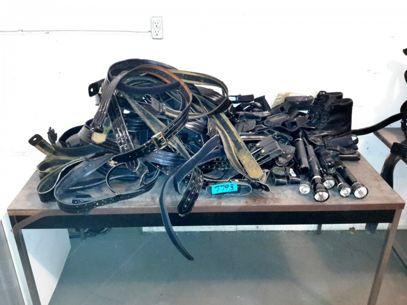 Description: Lot consisting of 2 each tables of miscellaneous police/security leather equipment such as holsters, belts and all other gear needed to carry such items on your person. The winning bidder will be responsible for bringing with them boxes and/or bins for picking these items up.
