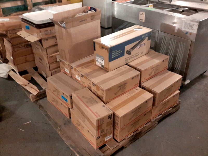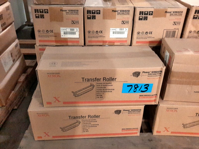 Description: 1 each pallet consisting of 32 each Phaser 6200/6250 color laser printer transfer rollers, 1 each model C3965A black developer unit, & 1 each box consisting of video tapes and miscellaneous toner cartridges. All units are new in box.