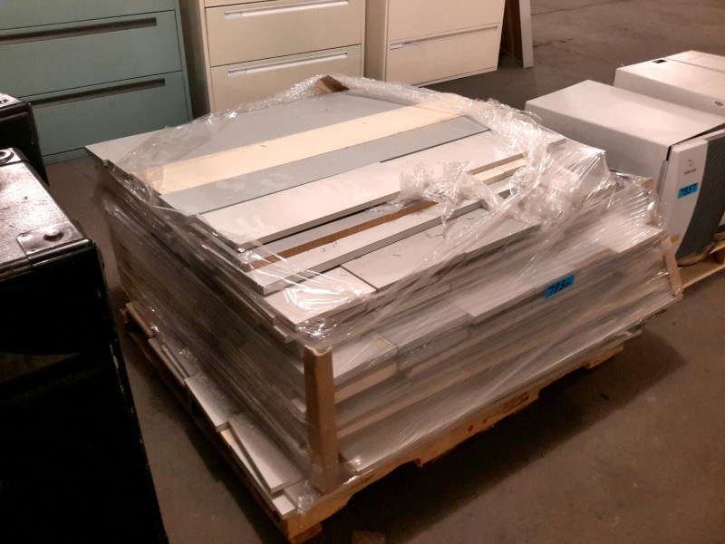 Description: Pallet consisting of miscellaneous laminate board pieces. Could be repurposed for shelves, or other.