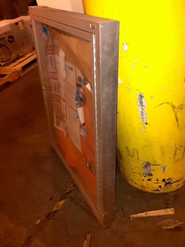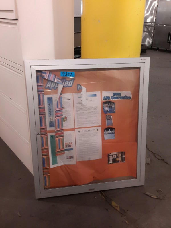 Description: 1 each enclosed aluminum framed lockable bulletine board. No key available.