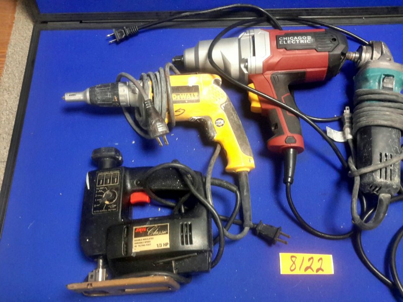 Description: Lot consisting of 5 each miscellaneous electric power tools. 1 each Skil jig saw, 1 each Dewalt drywall screwdriver, 1 each Chicago Electric 1/2" impact gun, 1 each Makita angel grinder, and 1 each Skil 1/4" drill