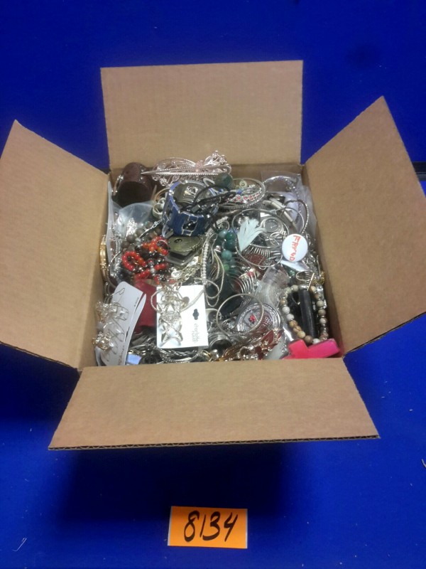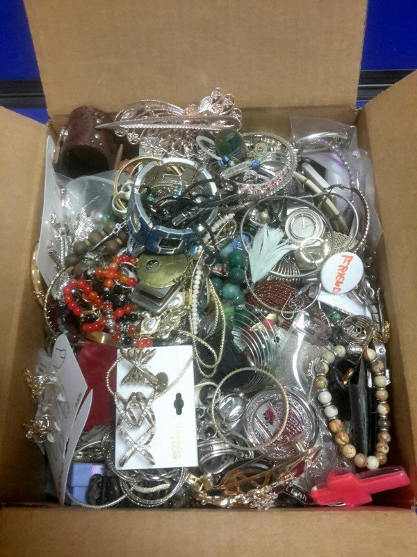 Description: Lot consisting of 1 each box of miscellaneous pieces of costume jewelry. Box dimensions = 11 1/4"x9 3/4"x5". This lot will not be available for public viewing. See picture gallery.