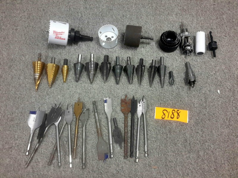 Description: Lot consisting of miscellaneous hole saw drill bits, step drill bits, and flat wood drill bits.