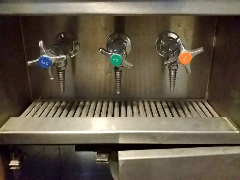 Description: 1 each miscellaneous item, unit is made of square tubing, stainless steel, and has three valves on it for gas, cw, and air. The unit is also mounted to a wood platform.