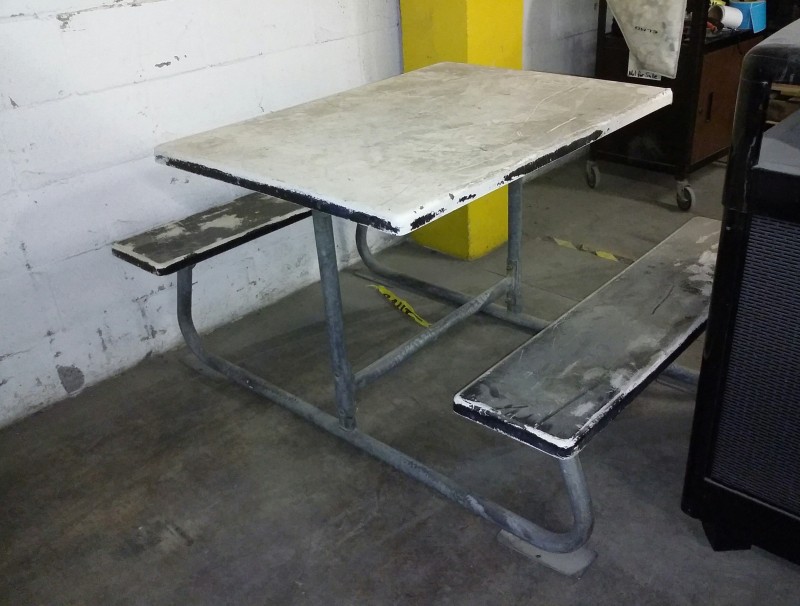 Description: 1 each fiberglass outdoor table with bench seats for four people.