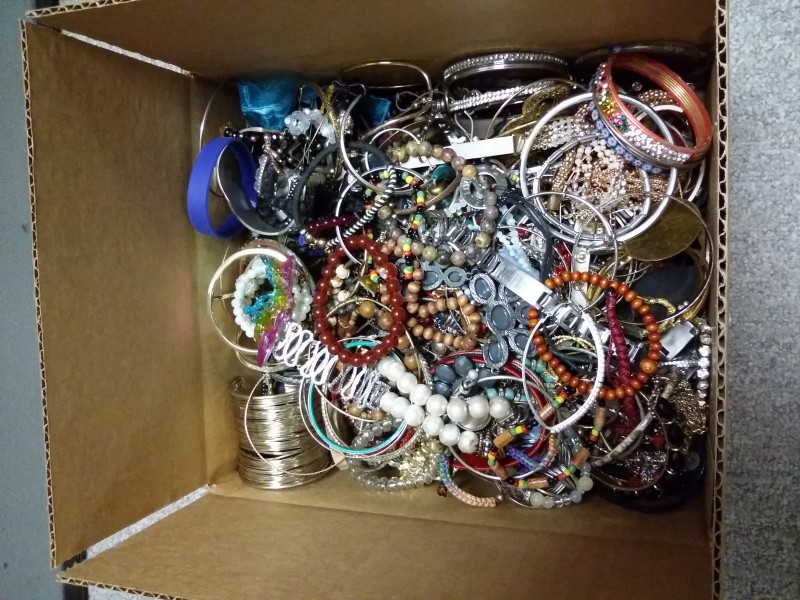 Description: Lot consisting of 1 each box of miscellaneous pieces of costume jewelry. Box dimensions = 11 1/4"x9 3/4"x5". This lot will not be available for public viewing. See picture gallery.