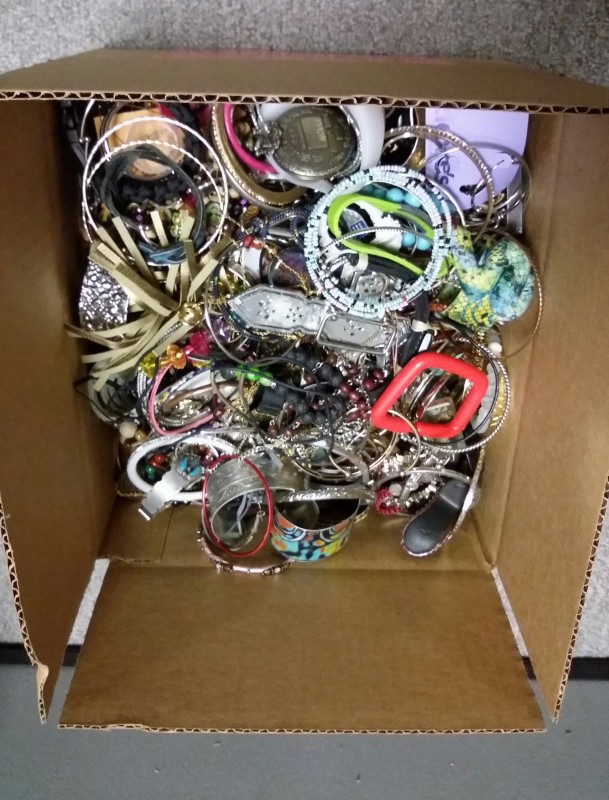 Description: Lot consisting of 1 each box of miscellaneous pieces of costume jewelry. Box dimensions = 11 1/4"x9 3/4"x5". This lot will not be available for public viewing. See picture gallery.