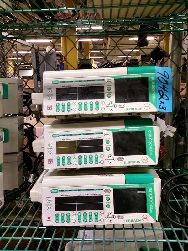 Description: Lot consisting of 3 each Braun Outlook 400es infusion IV pumps. These units were part of an upgrade and may, or may not function properly.