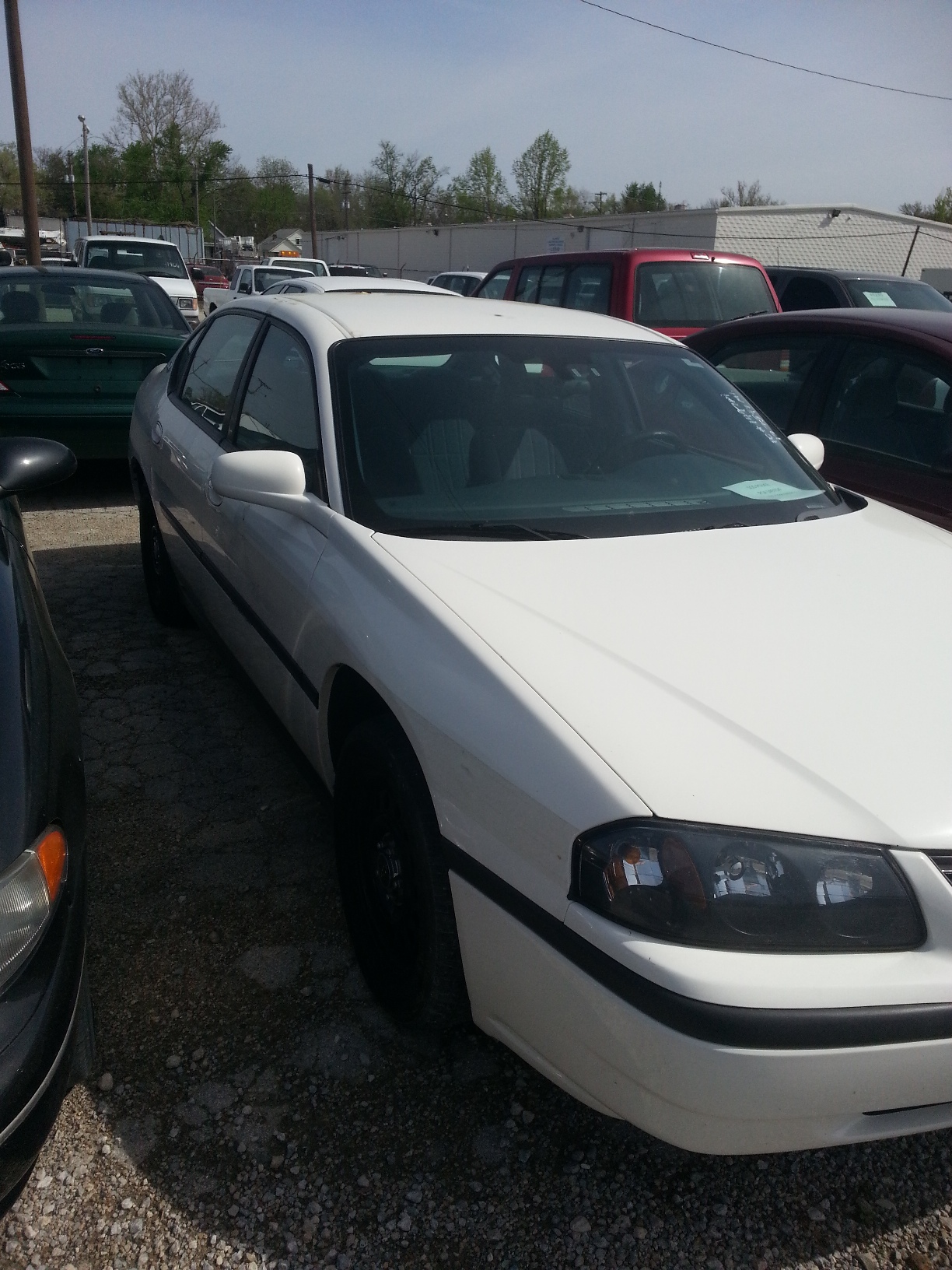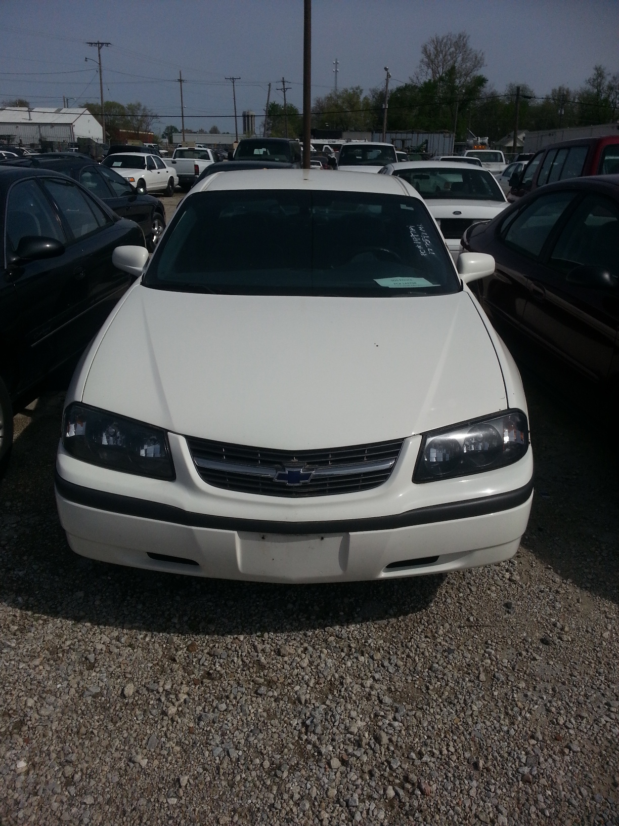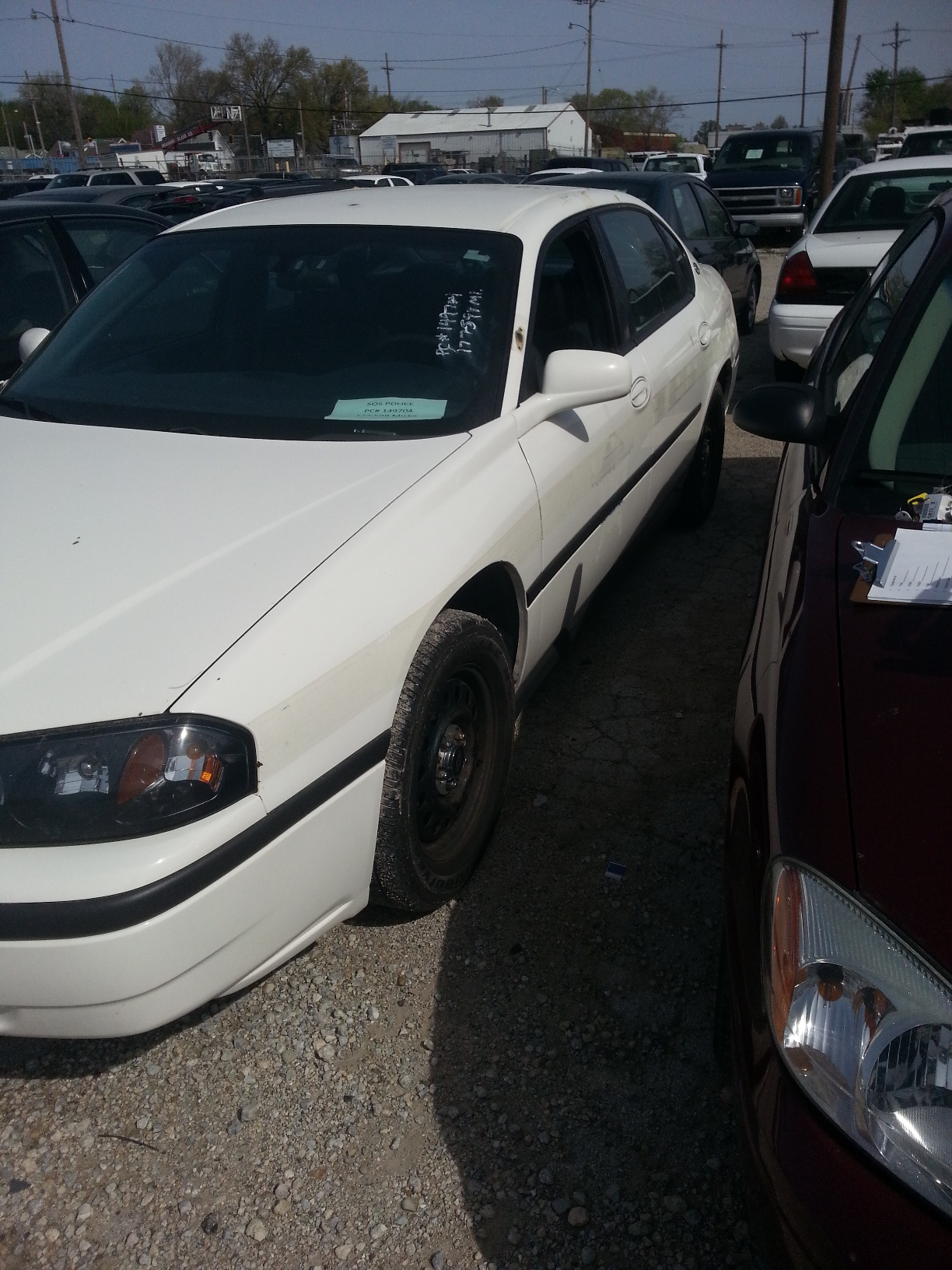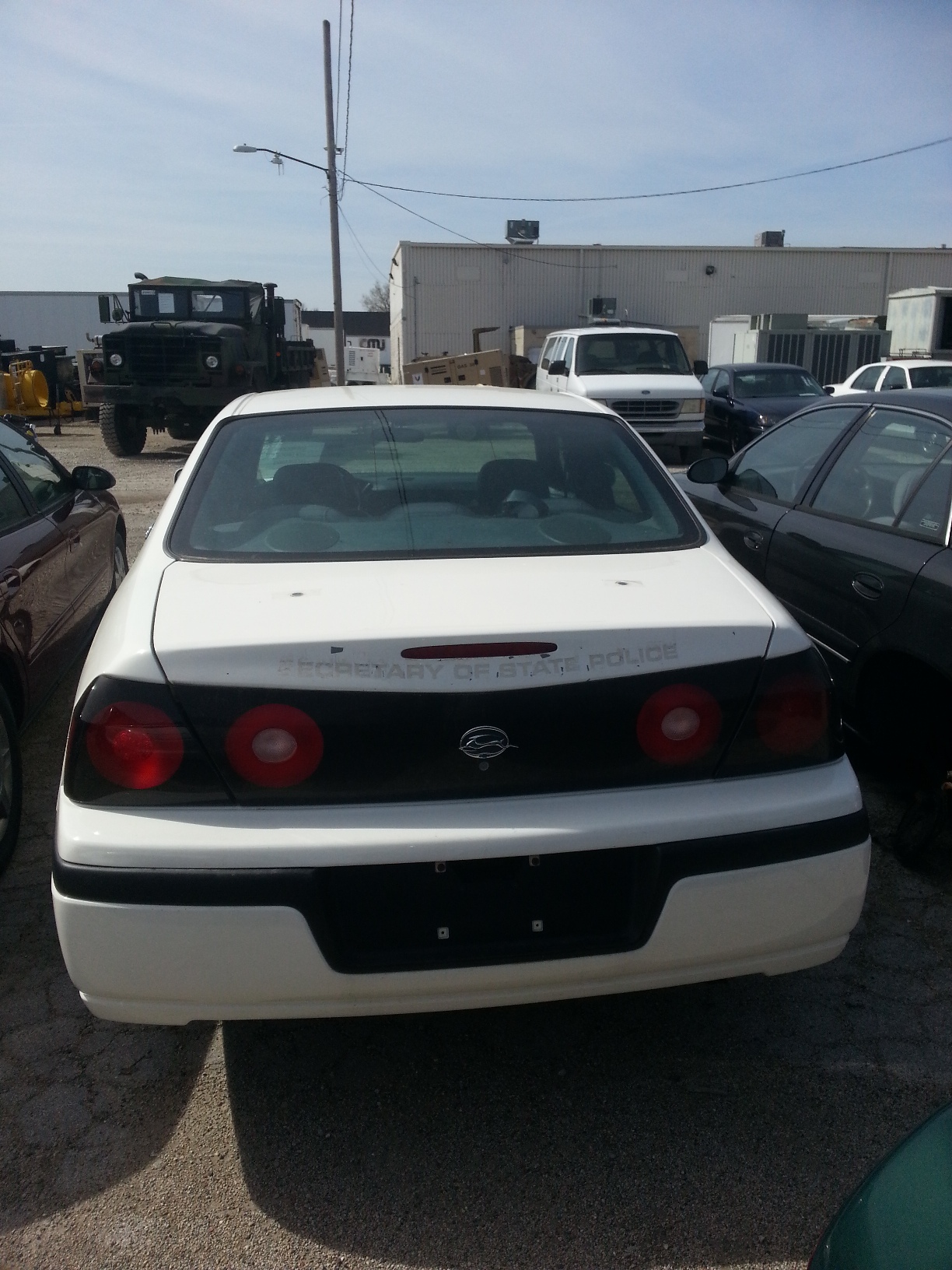 2004 Chevrolet Impala, Equip# PC149704, VIN#2G1WF55K349336665 White/ Ext../Blue/Int.Starts with a jump, Moves Forward and Backward, Cruise Control, Air Conditioning, AM/FM Radio/Tape Player, Electric Windows and Locks, Clean, 177618 Miles. Engine: 3.8L V6 OHV 12V