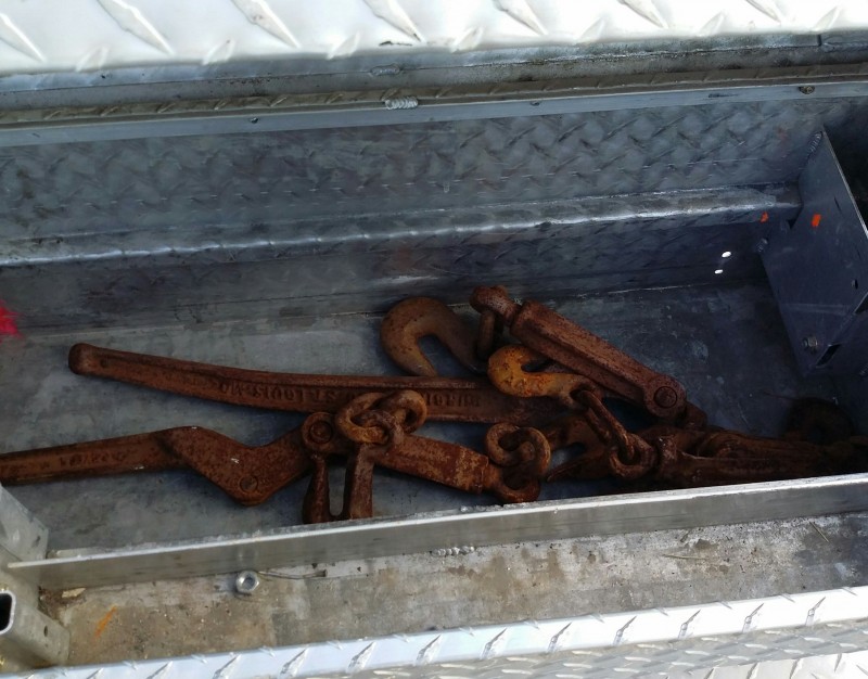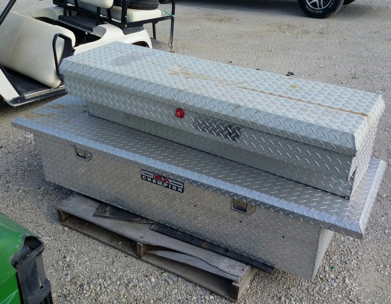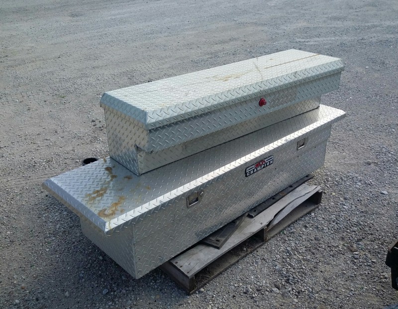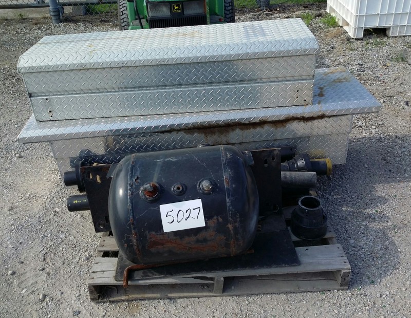 Description: 1 each pallet consisting of miscellaneous items including an air tank, misc. driveshaft covers, and 2 each diamond plate truck bed tool boxes.